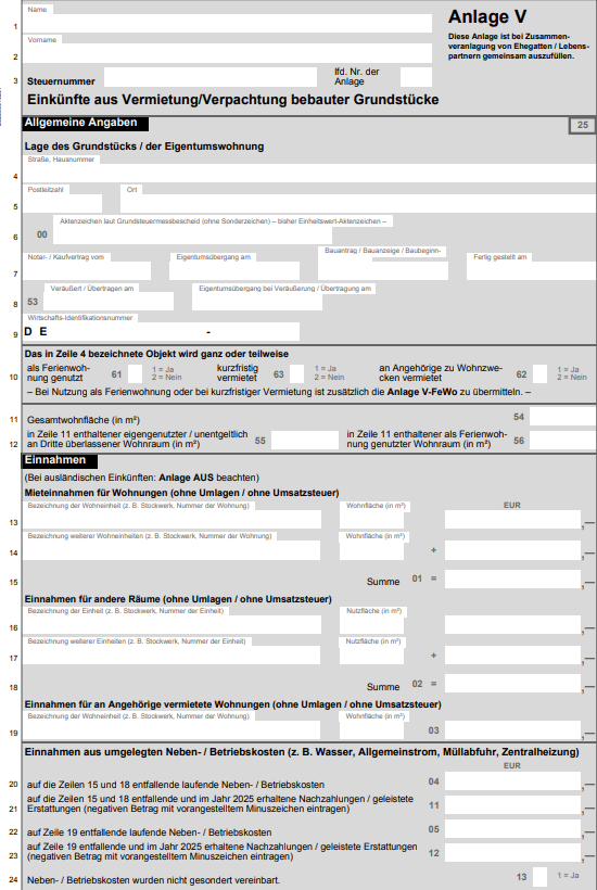 Mieteinnahmen und dazugehörige Werbungskosten tragen Sie in der Anlage V ("Einkünfte aus Vermietung und Verpachtung") Ihrer Steuererklärung ein. Bei Ferienwohnungen kommt zusätzlich die Anlage V-FeWo zum Einsatz, bei Auslandsimmobilien die Anlage AUS.