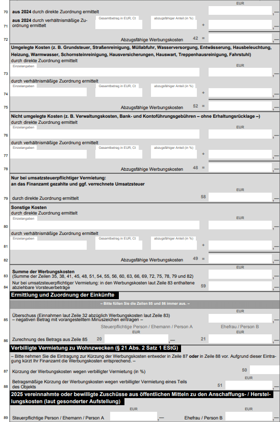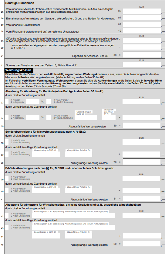 Tragen Sie hier Ihre Werbungskosten ein. Darunter zählen alle "Aufwendungen zur Erwerbung, Sicherung und Erhaltung von Einnahmen". Aufwendungen im Zusammenhang mit Räumen, die Sie zu eigenen beruflichen oder gewerblichen Zwecken nutzen, können nicht als Werbungskosten bei den Einkünften aus Vermietung und Verpachtung geltend gemacht werden. Sie können sie stattdessen als Werbungskosten oder Betriebskosten im Zusammenhang mit Ihrer Nutzung der Räume geltend machen.