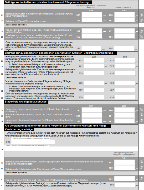Diese werden in Zeile 37 bis 42 eingetragen (Ausnahme: Kinder, bei denen Sie einen Anspruch auf Kindergeld oder einen Kinderfreibetrag haben; Beiträge für diese tragen Sie in der Anlage Kind in den Zeilen 26 bis 37 ein).