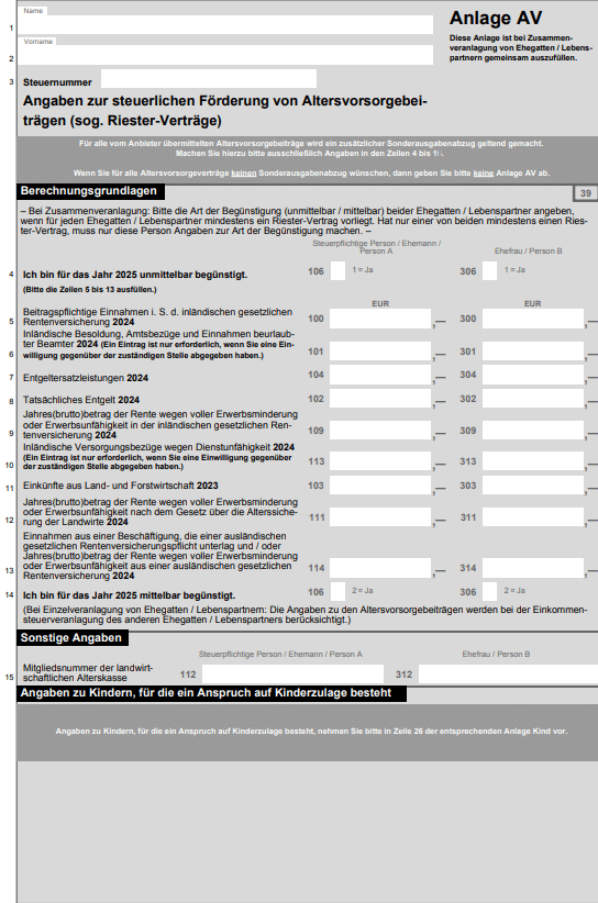 Die Felder für diese Angaben befinden sich auf der zweiten Seite der „Anlage AV“. Dort sind sie in den Zeilen 16 bis 25 eingetragen.