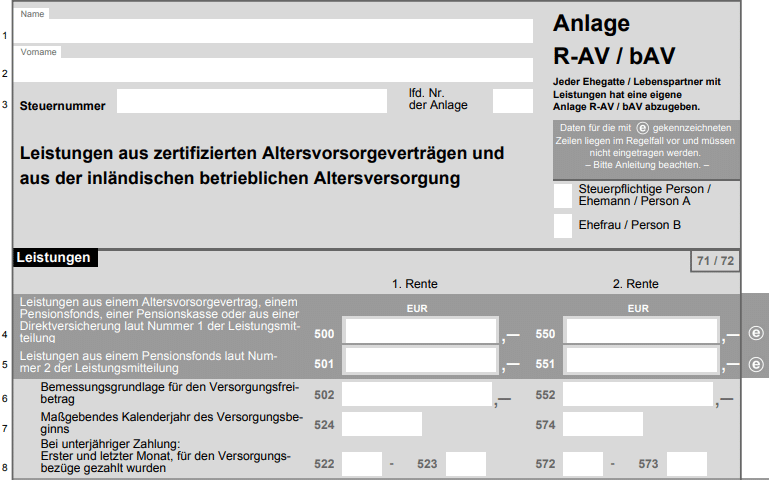Die Besteuerung Ihrer Riester-Rente erfolgt auch in der Auszahlphase nicht automatisch. Leistungen aus zertifizierten Altersvorsorgeverträgen – wie der Riester-Rente – oder aus der betrieblichen Altersvorsorge müssen Sie selbst in der „Anlage R-AV/bAV“ angeben. Die Riester-Rente tragen Riester-Sparer in das Feld „Leistungen aus einem Altersvorsorgevertrag“ ein. Wer eine betriebliche Riester-Rente bezieht, trägt diese in das dazugehörige Feld für betriebliche Verträge ein.